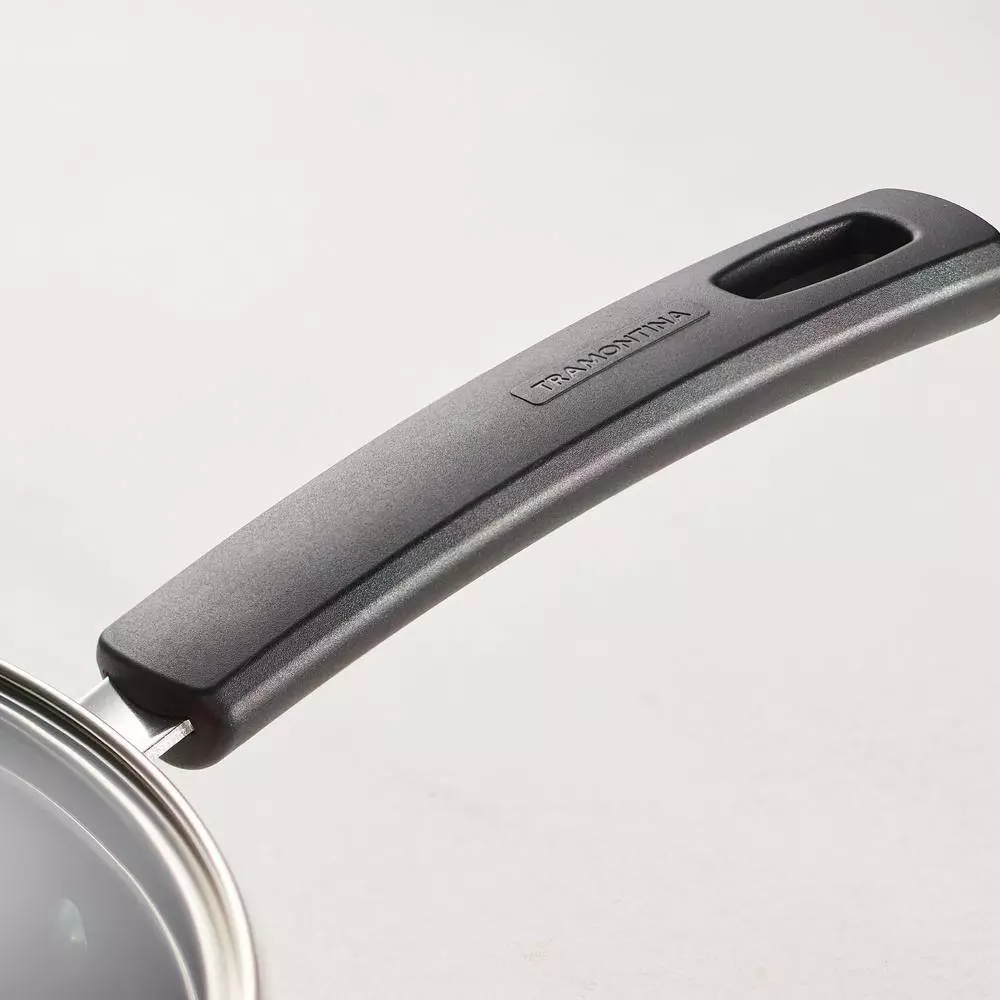 Tramontina Sicilia 2.5 qt. Aluminum Nonstick Covered Sauce Pan has room to reheat soups and prepare flavorful sauces for your meals. The even gauge construction and heavy-gauge aluminum exterior mean you’ll have this pan in your kitchen for years to come. The Starflon Excellent nonstick interior finish is Tramontina proprietary nonstick system, which makes clean up less stressful. The matching heat and shatter resistant tempered glass lid has a vent hole and stainless steel rim, allowing you to watch the process of your meal while it’s simmering. The long handles are Sicilia style stamped shank with over molded Bakelite, which means this sauce pan is not for oven use. This cookware is made in Brazil and available in several colors.