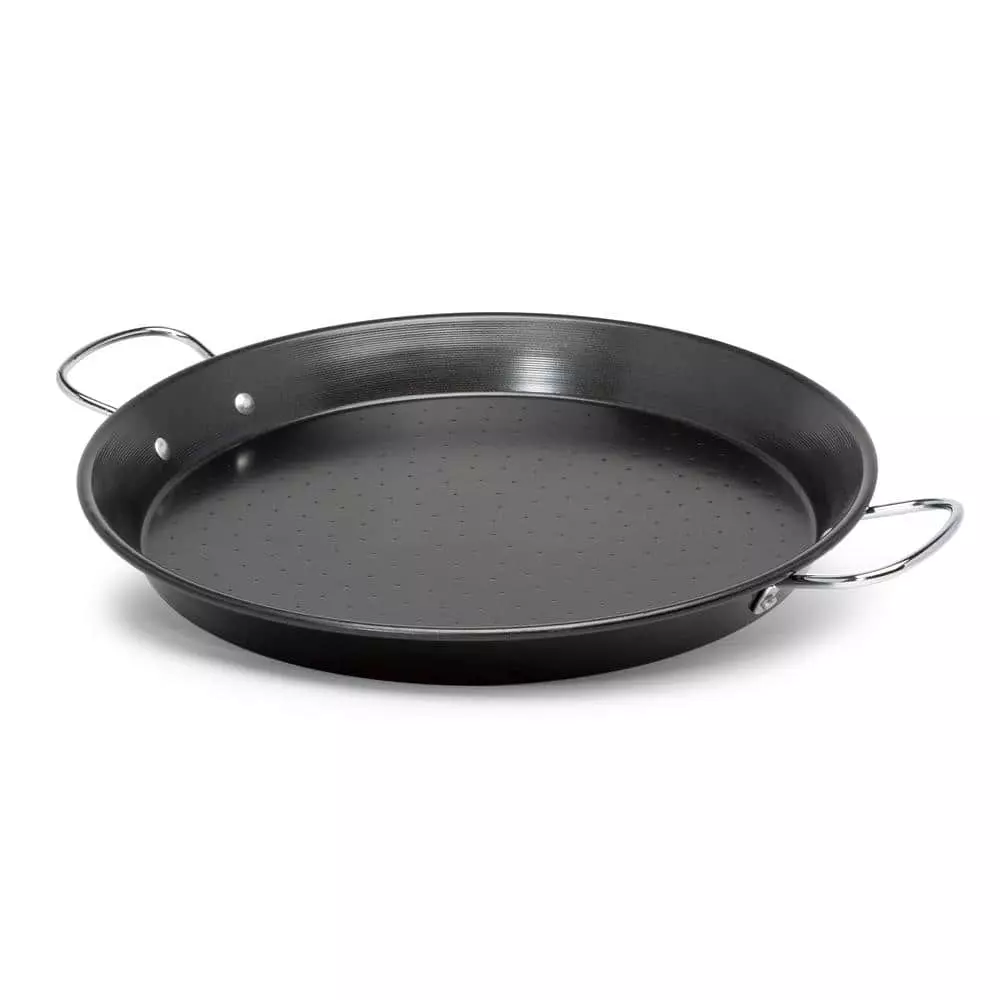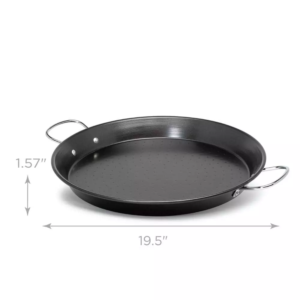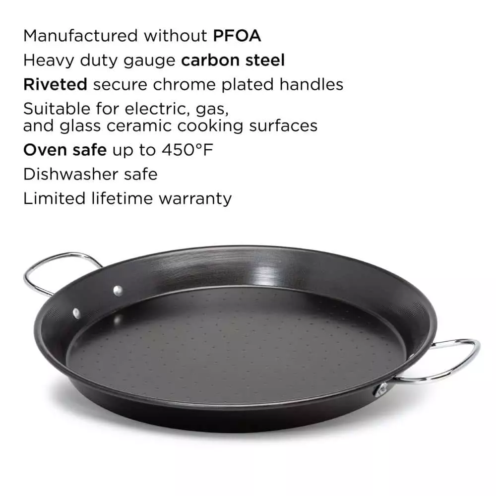 This beautifully designed pan features the classic wide and shallow shape recommended for paella. Made of heavy-duty gauge carbon steel, it heats quickly and evenly. Its PFOA-free non-stick coating adds to its convenience. The riveted steel handles offer a firm and stable grip for carrying from stovetop to table for serving. The pan is dishwasher safe for quick clean up. The Ecolution SOL 16 in. Carbon Steel Paella Pan works on any stovetop, including induction. After your purchase please consider how to recycle your old cookware. You can visit Ecolutionhome.com to get a listing of local charities to donate your cookware or ways to renew/ recycle your old pans, you know “the other stuff in your cabinet”. Ecolution believes that cooking well in the kitchen and doing good for the planet can happen at the same time. From our family of chefs to yours we say Cook Well. Do Good.