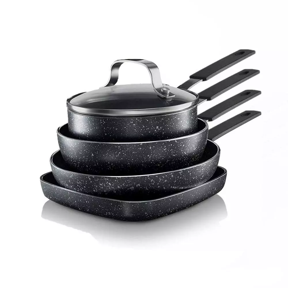 - Set includes: 6.5 in. fry pan, 6.18 in. square fry pan, 0.75 Qt. sauce pan with glass lid, and 5.75 in. wok