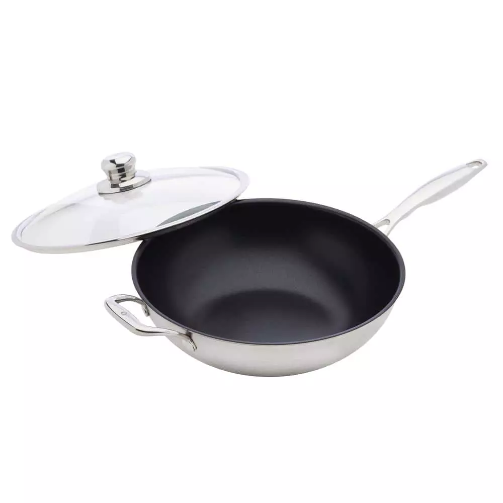 Your stir-fry skills have not reached their fullest potential without this Nonstick Clad 12.5 in. Wok. This wok meets all of your cooking needs. Poach, braise, fry or sear your meats and vegetables all together and then clean up with ease. Like all Nonstick Clad pieces, this wok has a solid foundation built from five layers comprised of an 18/0 magnetic stainless steel base layer, alternating alloy and pure aluminum, topped off with an 18/10 stainless steel layer finished off with our groundbreaking diamond nonstick coating, making this the most prestigious line in stainless steel cookware yet.