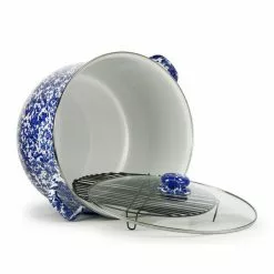 6 qt. Stock Pot, 5 in. deep x 9.25 in. wide interior This enamelware is made of carbon steel coated with a porcelain enamel and trimmed in stainless steel. There will be variations in the shading of colors and pattern formations which are the results of the hand-dipped process. The swirl design is a classic, retro staple for enamelware cookware and serveware. The contrast of colors creates a distinct look and brings a casual artistic flair to your table setting. Each piece is individually hand crafted and is as unique as you are. Skilled artisans hand dip the white background color, then use a brush to hand apply the secondary color swirls. This creates a unique piece and design each time. The elegant and inviting aesthetic draws the eyes into the many spattered patterns flowing throughout. Your piece will be one-of-a-kind and exclusive to you as you create your own distinctive style.