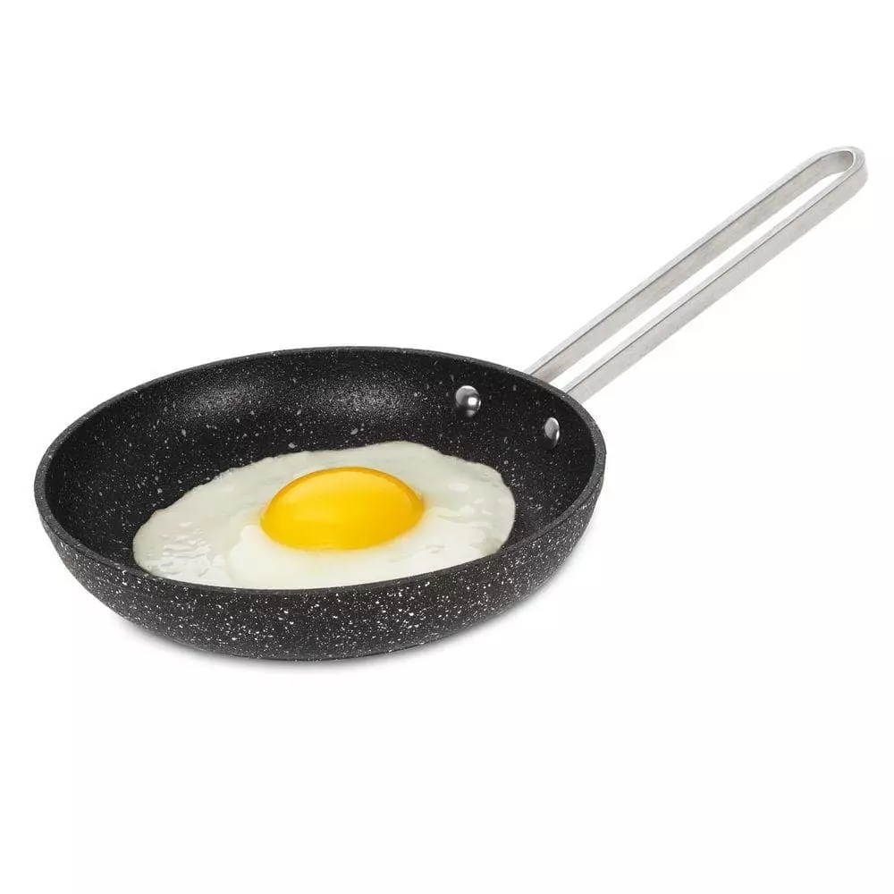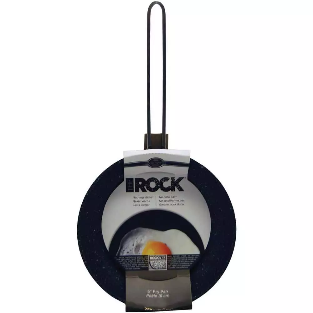 Here’s a small but tough personal fry pan! The ideal addition to your kitchen’s cookware, THE ROCK by Starfrit 6.5 in. Fry Pan with Stainless Steel Wire Handle has a rocklike finish that makes it extremely durable. A thick, forged aluminum base makes this pan hardy, and spreads heat evenly for precise and thorough cooking. The patented Rock.Tec manufacturing process ensures superior nonsticking capability. The pan is also ovenproof, even under the broiler, up to 350°F. This handy, long-lasting pan will quickly become a staple in any cooking endeavor.