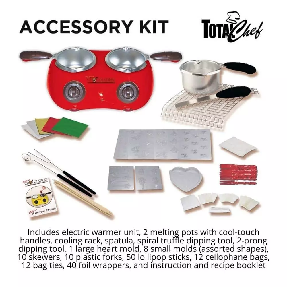 - What’s In The Box: Electric warmer unit with dual warmers; 2 melting pots with plastic handles; 10 clear plastic skewers; 10 plastic forks; 8 small molds (assorted shapes); 1 large heart mold; 1 draining/cooling rack; 1 spatula; 1 spiral truffle dipping tool; 1 flat 2-prong dipping tool; 50 lollipop sticks; 12 cellophane bags (assorted sizes); 12 bag ties; 40 foil wrappers (assorted sizes and colors); instruction and recipe booklet