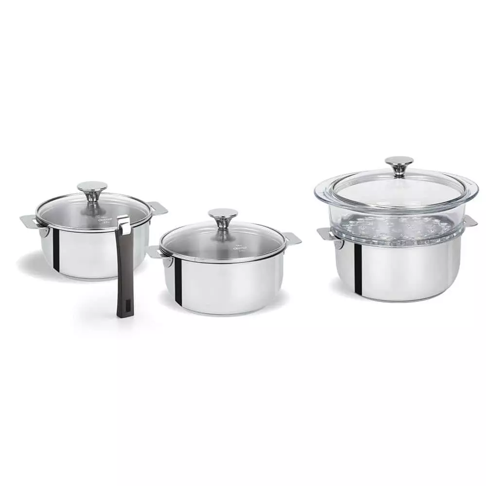 - What’s in the box? A 1 Qt., 2 Qt. and 3 Qt. saucepans and an 8 in. glass steamer to fit the 3 Qt. saucepans, with a detachable long handle