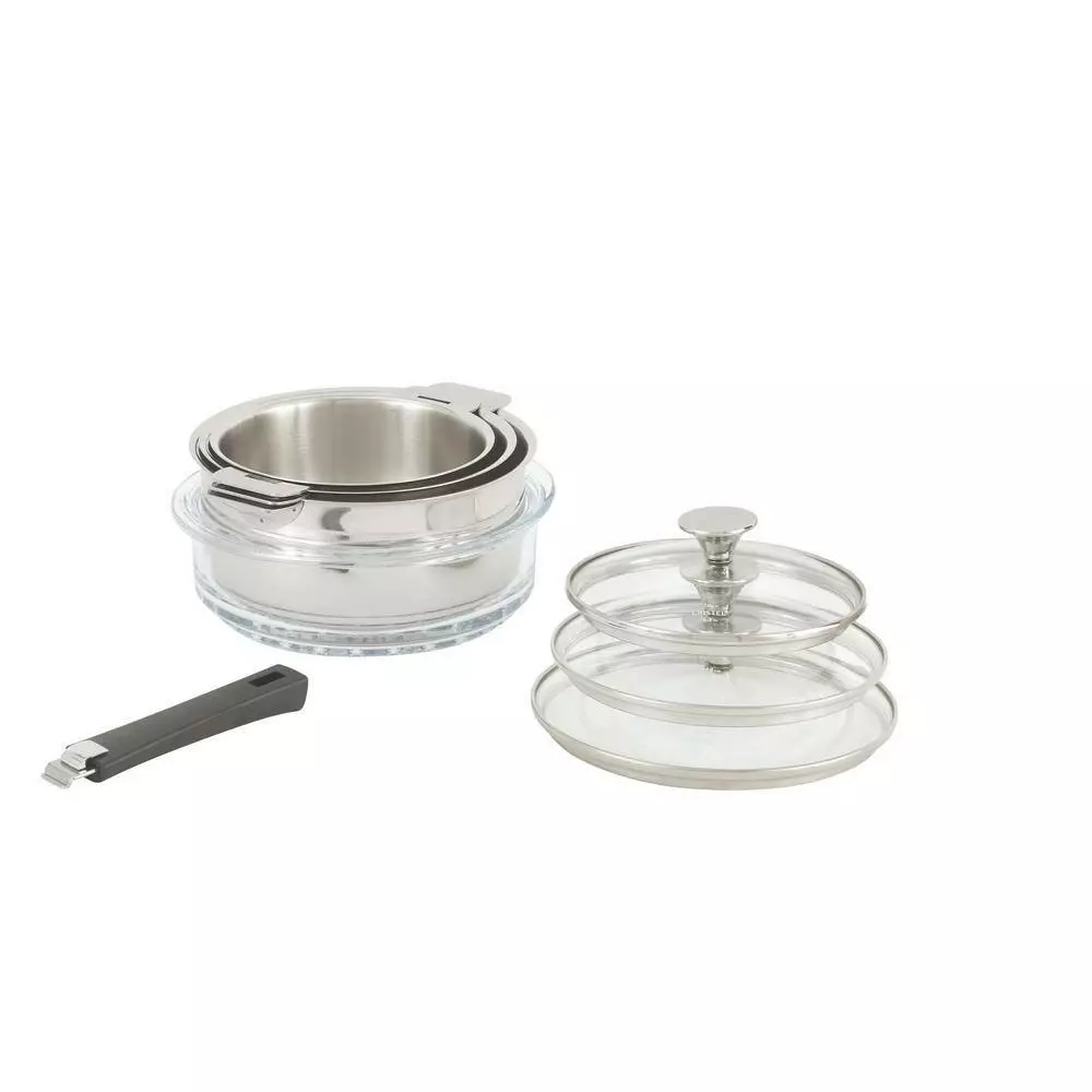 Exclusive to Home Depot, this Tulipe 8-Piece Stainless Steel Sauce Pan Set combines performance and elegance. This innovative cookware features a detachable handle that is interchangeable and fits all pans, adding more versatility to each vessel.