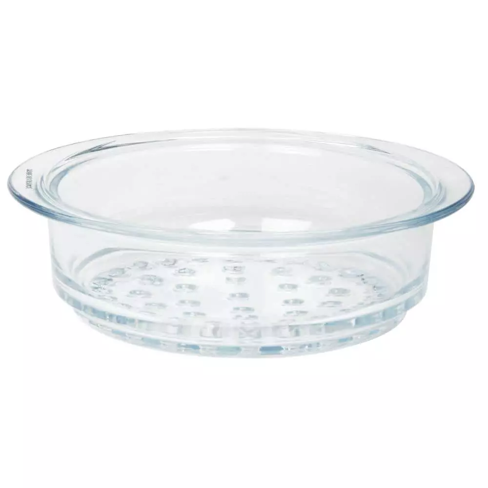 The 9.5 in. glass steamer without lid fits the 3.5 Qt. saut pan and is included in the 9-Piece starter set. It uses the lid that comes with the 3.5 Qt. saut pan. It offers advantages over conventional steamers as you can monitor cooking performance from the sides and the top. Made from durable borosilicate glass in France.