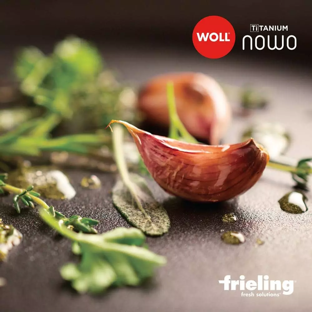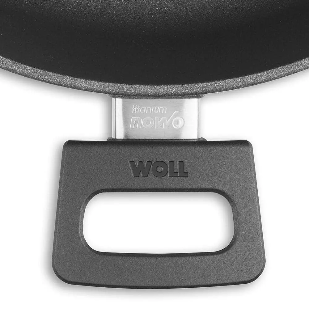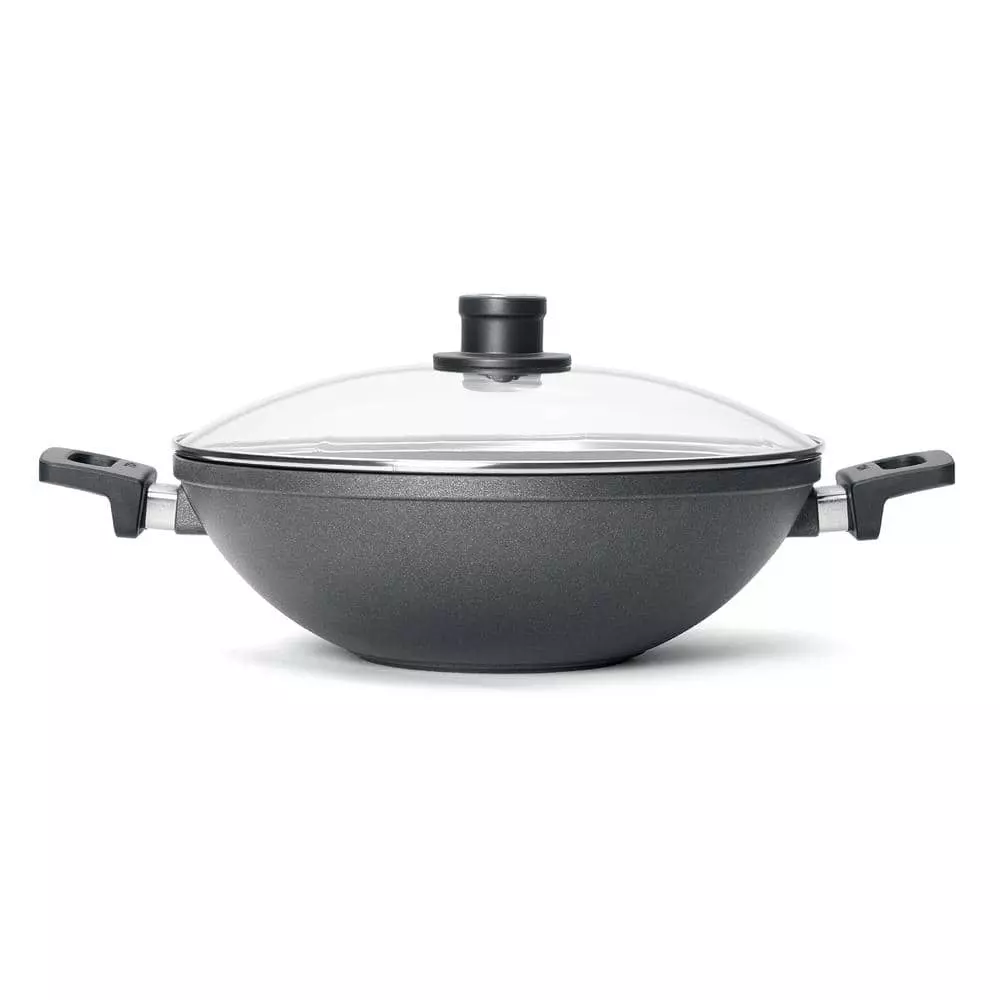 Titanium reinforced nonstick coating cast aluminum wok with side handles; 12.5 in. Dia Aluminum base topped with 4-layers and a non stick Titanium top coat; use with induction, gas or electric stoves; safety glass lid with steam vent knob. 2-side cast handles for safe lifting and handling; integral, threaded brass insert for sturdy, firmly affixed handles. Titanium coating makes clean up easier, improves the release of food. Made in Germany; oven safe to 480F/250 C; dishwasher safe; PFOA free; limited lifetime warranty Advanced titanium reinforced nonstick for superior durability, nonstick release, and easy cleanup Patented heavy duty, easy click on and off detachable handles are perfect for tight storage spaces, or stove to oven uses Easily turn a fry pan or saute pan into a casserole, baking dish or pie pan just by clicking off handle Pans are oven safe to 500° F/260° C, and are dishwasher and metal utensil safe; PFOA free Limited lifetime warranty; Made in Germany.